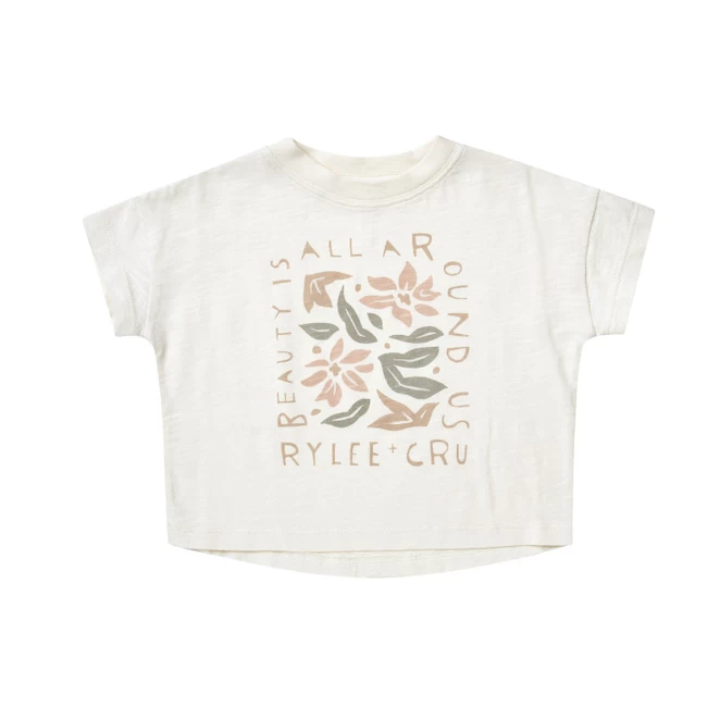 Super soft boxy fit tee with a round neckline and dropped sleeves.