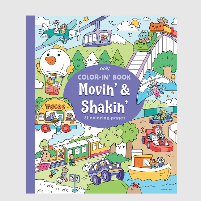 Help keep your on-the-go kiddo engaged with this adorable Movin’ and Shakin’ Coloring Book. From roller coasters, to trains, to buses, this whimsical coloring book for kids will keep their creativity moving!