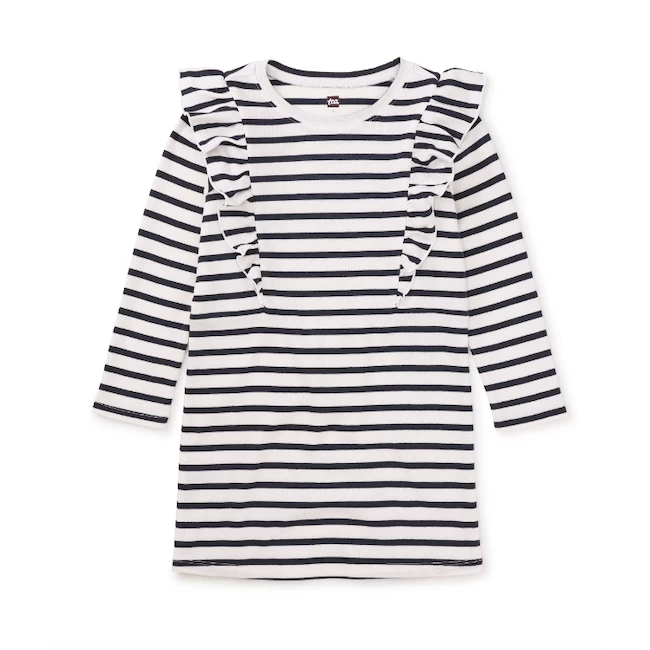 With its black-and-white stripe print and adorable ruffle detail, this pretty dress is a great wardrobe transition piece—wear with leggings in cooler weather and bare legs in warm. Crafted from 100% soft cotton jersey. Below mid-thigh length.