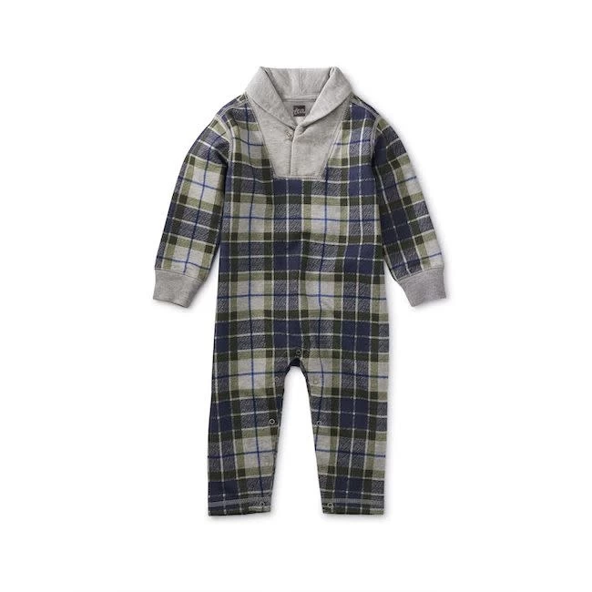 Tea rompers are legendary for being super easy to put on and take off–and for amazing design details, too! This good looking style sports a dignified shawl collar, button closure at neck and inner leg snaps. 100% cotton French terry.